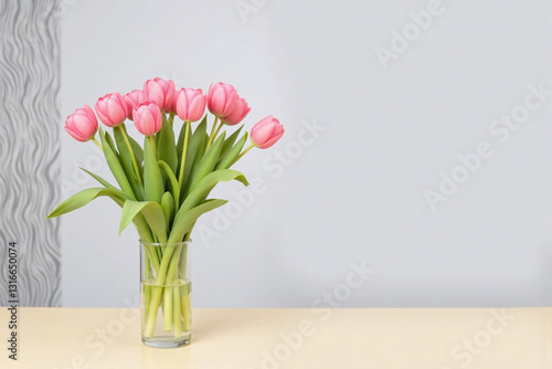 vase, filled, pink, tulip, sitting, background, wallpaper