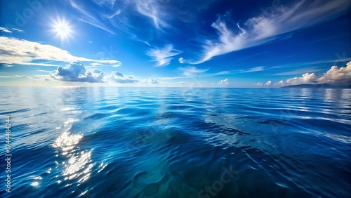 ocean, sea, water, blue, sky, cloud, sun, sunlight, horizon, huge, expanse, nature, scenic, landscape, tropical, summer, vacation, travel, peaceful, calm, serene, tranquil, beauty, natural, daylight, bright, clear, deep, surface, ripple, wave, light, shimmering, sparkling, oceanic, seascape, paradise, coast, aquatic, marin