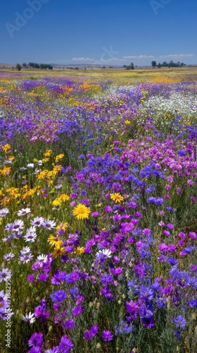 flower, field, colourful, spring, bloom, blossom, nature, vibrant, landscape, wildflower, beauty, meadow, flower petals, blue, sky, flora, botany, growth, scenic, outdoors, wild, yellow, purple, white, orange, green, sunny, sunlight, season, summer, plant, daisy, poppy, iris, crocus, tulip, garden, floral, fresh, natural, idylli, picturesque, panoramic, ecology, springtime, california, blooming