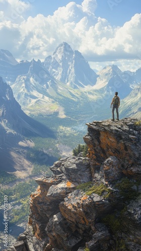Vast mountain landscape with hiker standing on cliff during bright day exploring wilderness