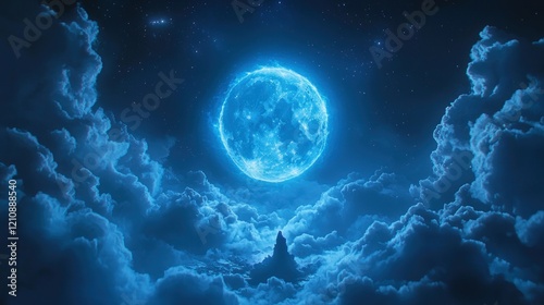 Vast night sky, blue moon, dramatic clouds, mountain silhouette