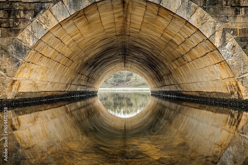 Vaulted bridge structure creates stunning mirror reflection beneath in calm water during early morning light