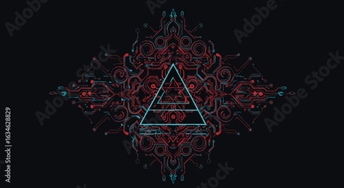 vector, triangle, circuit, board, geometric, abstract, futuristic, tech, blue, red, interconnected, line, node, symmetric, digital, cyber, security, web, branding, background, editable, crisp, professional, versatile, print, corporate, modern, technology, network, electronic