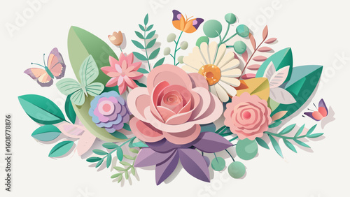 Vector art of an enchanting papercut floral composition with delicate flowers, lush leaves, and graceful butterflies in soft pastel hues
