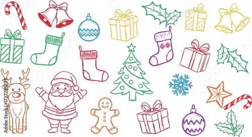 christmas, santa, reindeer, gift, present, tree, ornament, bell, stocking, candy, cane, holly, leaf, star, snowflake, gingerbread, man, snowman, angel, chaplet, bow, ribbon, hat, foulard, glove, mitten, sleigh, carol, song, music, joy, happy, holiday, winter, season, celebration, festive, tradition, cute, drawing, doodle, vignetting, symbol, design, element, graphic, art