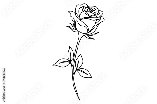 rose, flower, stem, leaf, floral, botanical, plant, garden, nature, bloom, blossom, romance, love, valentine, beauty, elegant, decorative, design, art, drawing, vignetting, outline, graphic, artwork, symbol, wedding, anniversary, gift, spring, summer, fragrance, thorn, bush, flora, single, contour, line, shape, clip art, element, decoration