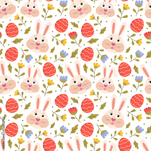 Vector Easter pattern with cute bunny, Easter eggs and flowers. Seamless holiday wallpaper, wrapping paper design