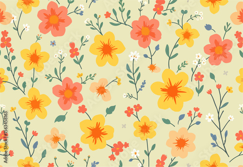 Vector floral seamless pattern in doodle style with flowers and leaves. Gentle, summer floral background.