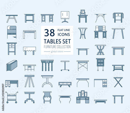 Vector furniture line icons, table symbols. silhouette of different table - dinner, writing, dressing table. Linear desk pictograms with editable stroke for furniture store, platen storage.