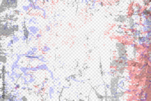 Vector illustration. Abstract artistic grunge texture layers with distressed details. Mix of red, blue, and grey color ink splashes on transparent background. Design for web banner, horizontal overlay
