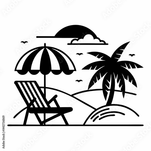 beach, summer, sea, palm, island, tree, vector, tropical, illustration, sun, umbrella, travel, water, sand, ocean, vacation, landscape, nature, holiday, sky, paradise, chair, design, relax, resort