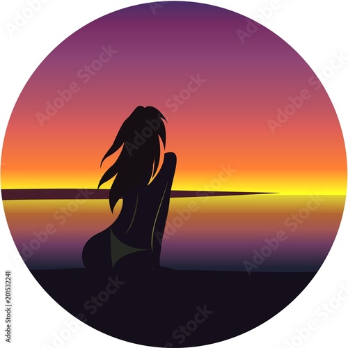 beach, beautiful, girl, illustration, sea, vector, woman, background, ocean, summer, sun, female, relax, tropical, vacation, sky, sunset, travel, young, silhouette, healthy, holiday, paradise, sand, attractive, bikini, horizon, purple, hot
