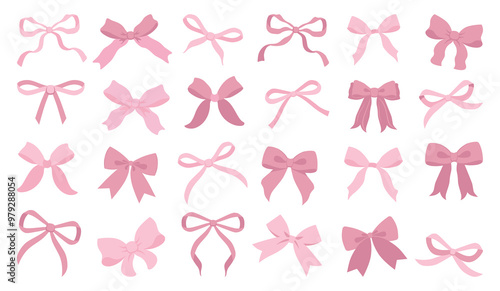 Vector Illustration of pink vintage bows. Girly hair decor, flat icon. Ribbons isolated. Trendy girls accessories. Cute hairstyle elements collection. Simple hand drawn bow collection. Bowknot for dec