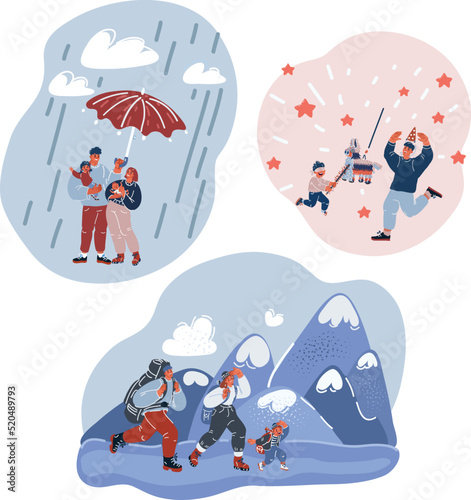 Vector illustration of Scene with family having a good time. Family goes camping, the husband holds an umbrella, the father and son play pinata