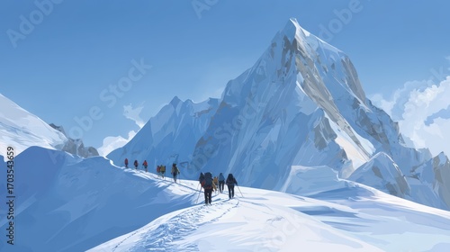 Vector illustration of splitboard crew climbing mountain