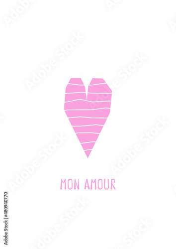 Vector illustration with flat geometric heart with stripes and text - Mon Amour on white background. Template for greeting card to show love and sympathy. Vertical minimalistic banner