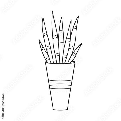 Vector outline house plant with long leaves. Indoor succulent plant in pot. Home plant for home and interior. Botanical doodle linear black and white illustration isolated on white background.