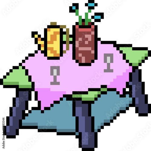pixel, art, isolated, cartoon, icon, cute, vector, small, table, living, furniture, rectangle, room, set, tea, cup, pot, jar, vase, decoration, flower, glasses