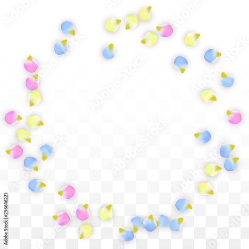 Vector Realistic Colorful Petals Falling on Transparent Background. Spring Romantic Flowers Illustration. Flying Petals. Sakura Spa Design. Blossom Confetti. Design Elements for Wedding Decoration.