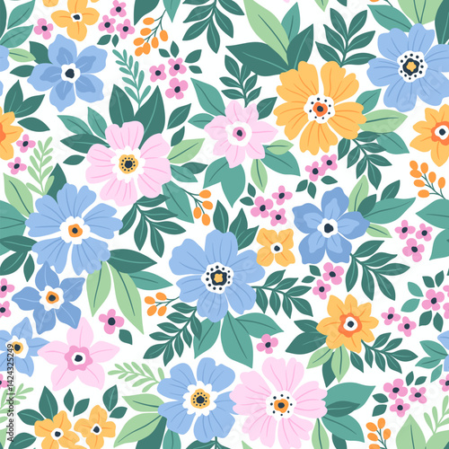 Vector romantic liberty floral seamless pattern. Flowers field floral pattern in soft and natural colors blue, pink, yellow. Beautiful digital textile seamless floral, white background. Stock print