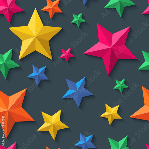 Vector seamless pattern with 3d stylized paper stars on black background. Holiday, night party colorful background.