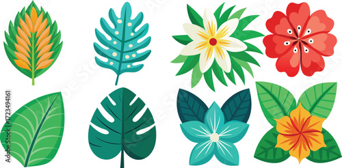Vector set of tropical flowers and leaves, colorful decorative elements for summer design, posters, and invitations
