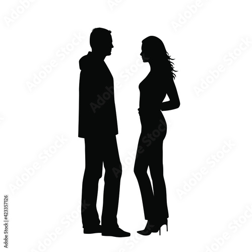 Vector silhouettes of man and a woman, a couple of standing business people, profile, black color isolated on white background