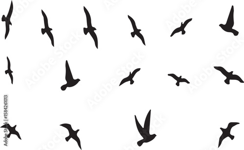 bird, silhouette, vector, flying, bird, nature, animal, illustration, fly, wing, black, wild, wildlife, icon, seagull, set, flight, pigeon, wing, freedom, dove, animal, sky, gull, drawing