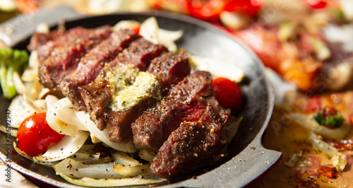meat, food, beef, steak, meal, dinner, plate, salad, grilled, vegetable, tomatoes, pork meat, dish, epicure, lunch, eatery, bar-b-q, sauce, roast, roasted, cooked, cookery, pepper, fried, red