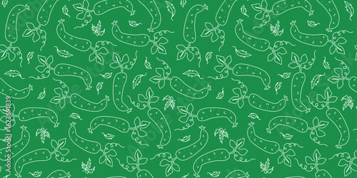 Vegetables, cucumber, leaves. Seamless pattern. Monochrome linear drawing. Line art icons. Harvest, garden. Natural vegetarian food. Repeating background.