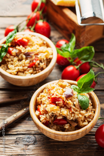 Vegetaian rice with onion, tomato and eggplant