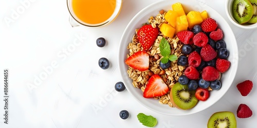Vegetarian Granola Breakfast with Fresh Fruits Overhead Shot on White Background. Concept Food Photography, Vegetarian Breakfast, Granola Bowl, Fresh Fruits, Overhead Shot