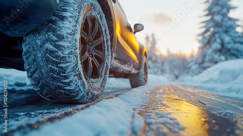Vehicle navigates snowy winter road at sunrise with close-up on icy tires
