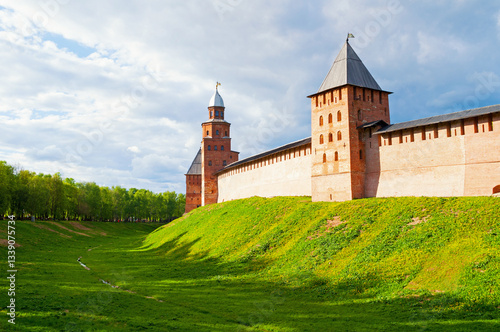 Veliky Novgorod, Russia. Towers and walls of Veliky Novgorod Kremlin fortress on the hill at summer sunset in Veliky Novgorod, Russia