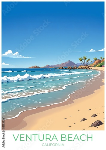 Ventura Beach Eco Friendly Travel Poster Illustration Retro Wall Art Print Decor Canvas Gift