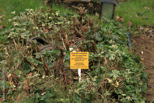 Vernachlässigtes Grab mit Hinweisschild des Friedhofsamts