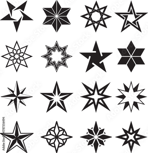 Versatile collection of black and white star symbols and shapes for creative graphic design projects, icons, or decorative elements.