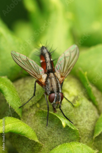 Vertical closeup on a red colored Tachinid fly, Mintho rufiventris in the garden