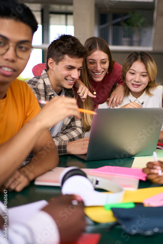 vertical, student, multiracial, together, smiling, happy, classmate, university, laptop, using, young, classroom, campus, female, academic, study, gathered, woman, man, 20s, sitting, male, inside, faculty, building, caucasian, african, american, asian, friends, colleague, socialise, meeting, team, table, casual attire, technology, device, international, people, lifestyle, friendship, reading, looking, computer, cafeteria, bar
