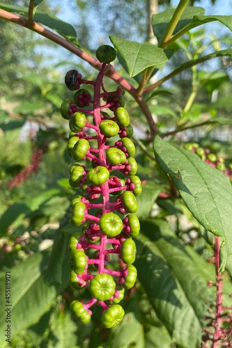 Vertical shot of Phytolacca americana (American pokeweed) plant fruits