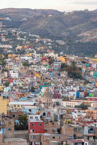 Very beautiful view of the city at sunset in the Mexican city of Guanajuato surrounded by large mountains.