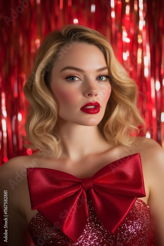 very beautiful woman with pink hair wearing a big bow, half body shot, red tinsel background, Valentines