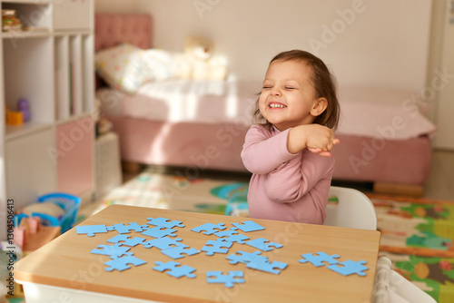 very excited little child girl connecting puzzle pieces on wooden desk in her room