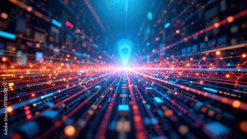 abstract, colourful, light, datum, technology, line, motion, three-dimensional, digital, futuristic, perspective, blue, red, orange, particle, network, virtual, energy, geometry