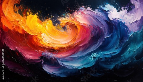Vibrant Abstract Painting of Swirling Rainbow Colors with Dynamic Brushstrokes on Black Background