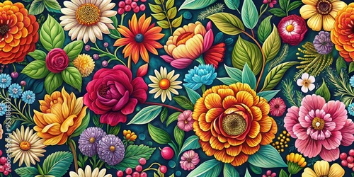Vibrant And Intricate Floral Artwork With A Rich Background Showcasing A Variety Of Blooms, Buds, And Foliage In A Seamless Vector Pattern.