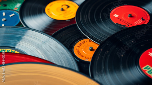 Vibrant and Textured Closeup of a Collection of Vinyl Records, Showcasing Retro Colors and Graphics in a Modern Artistic Arrangement.