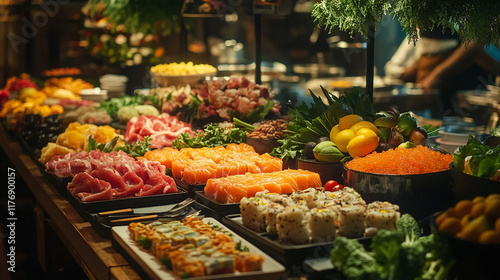 buffet, seafood, sushi, fresh produce, market, colourful, fruit, culinary, dining, variety, tropical, vegetable, epicure, healthy, feast, indulgence, texture, favor, specialty, preparation, ambience, ingredient, presentation, delicacy, freshness, choice, succulent, appetising, indulgent, enjoyment, gathering, cookery, community, social, shared, vibrant