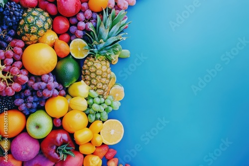 Vibrant assortment of fresh fruits displayed on a blue background for healthy living