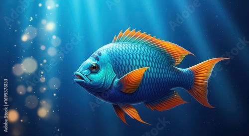 Vibrant blue fish with orange fins swimming in the deep blue sea water